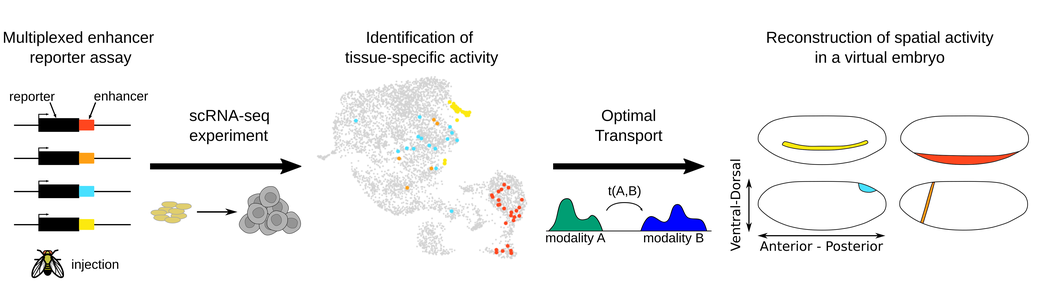 Enhancers play an essential role in developmental processes by regulating the spatiotemporal expression of genes. Characterizing their spatiotemporal activity remains however an important challenge. Here we introduce a novel in vivo/in silico method for spatial single-cell enhancer-reporter assays (spatial-scERA) designed to reconstruct the spatial activity of candidate enhancer regions in parallel in multicellular organisms. Spatial-scERA integrates parallel reporter assays with single-cell RNA sequencing and spatial reconstruction using optimal transport, to map cell-type-specific enhancer activity at the single-cell level on a 3D virtual sample. We evaluated spatial-scERA in Drosophila embryos using 25 candidate enhancers, and validated the robustness of our reconstructions by comparing them to in situ hybridization. Remarkably, spatial-scERA faithfully reconstructed the spatial activity of these enhancers, even when the reporter construct was expressed in as few as 10 cells. Our results demonstrate the importance of integrating transcriptomic and spatial data for accurately predicting enhancer activity patterns in complex multicellular samples and linking enhancers to their potential target genes. Overall, spatial-scERA provides a scalable approach to map the spatial activity of enhancers at single-cell resolution without the need for imaging or a priori knowledge of embryology and can be applied to any multicellular organism amenable to transgenesis.